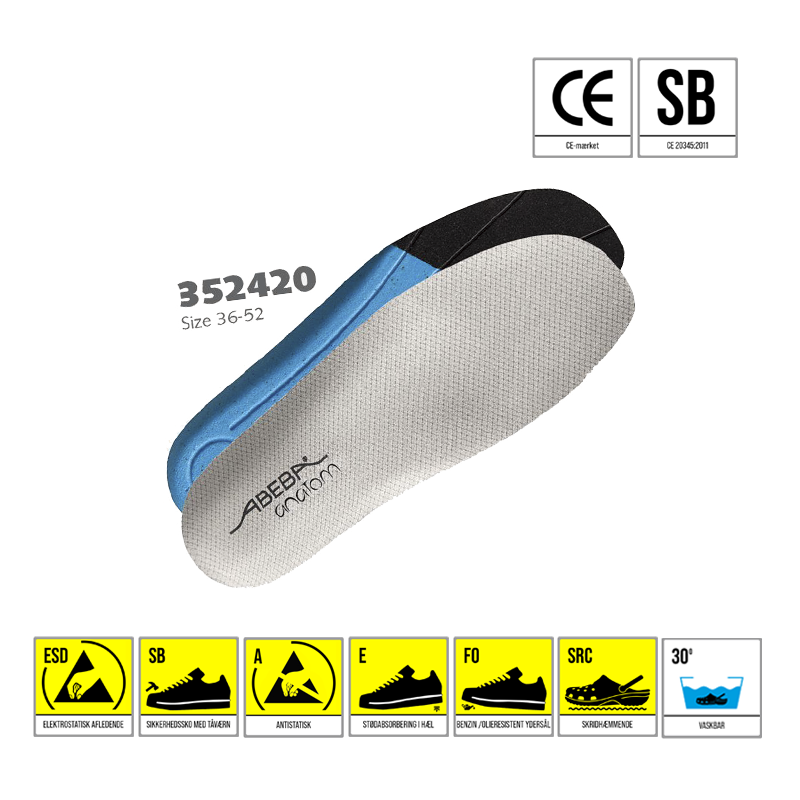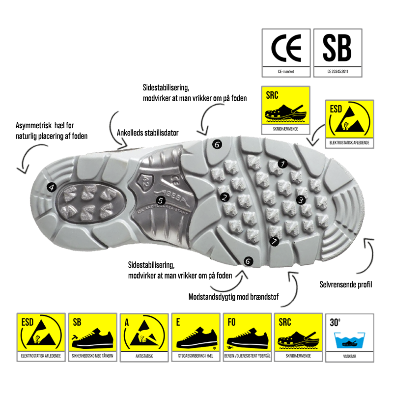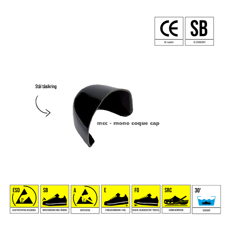 – CE godkendt i henhold til EN ISO 20345:2011, SB, A, E, FO, SRC.