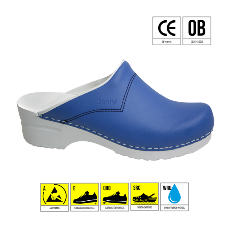 Klassisk åben træsko i dansk design med klampet overdel god svangstøtte og skridsikker ydersål.