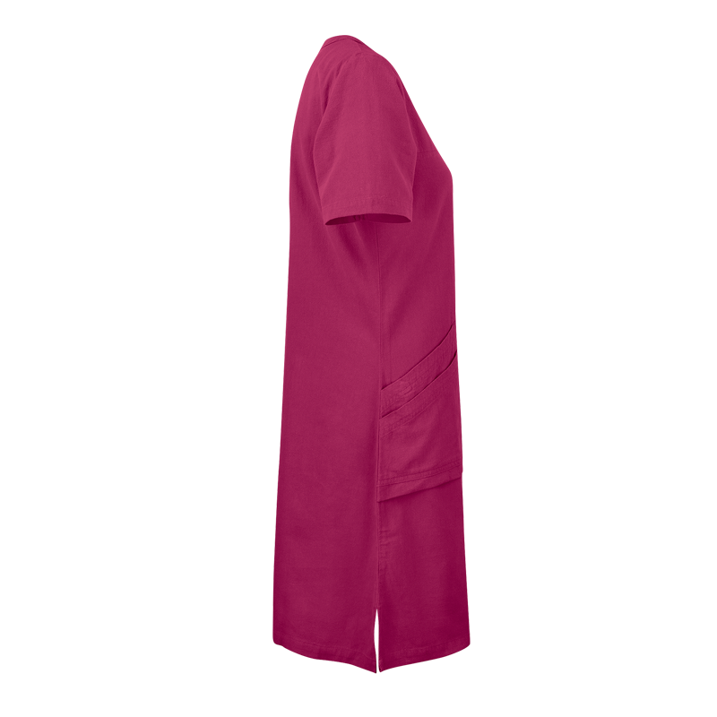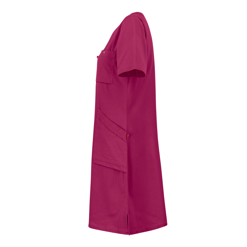 Lækker figursyet klinikkjole i 100% bomuld med brystlomme og t sidelommer samt nøgle- og kortholder.
