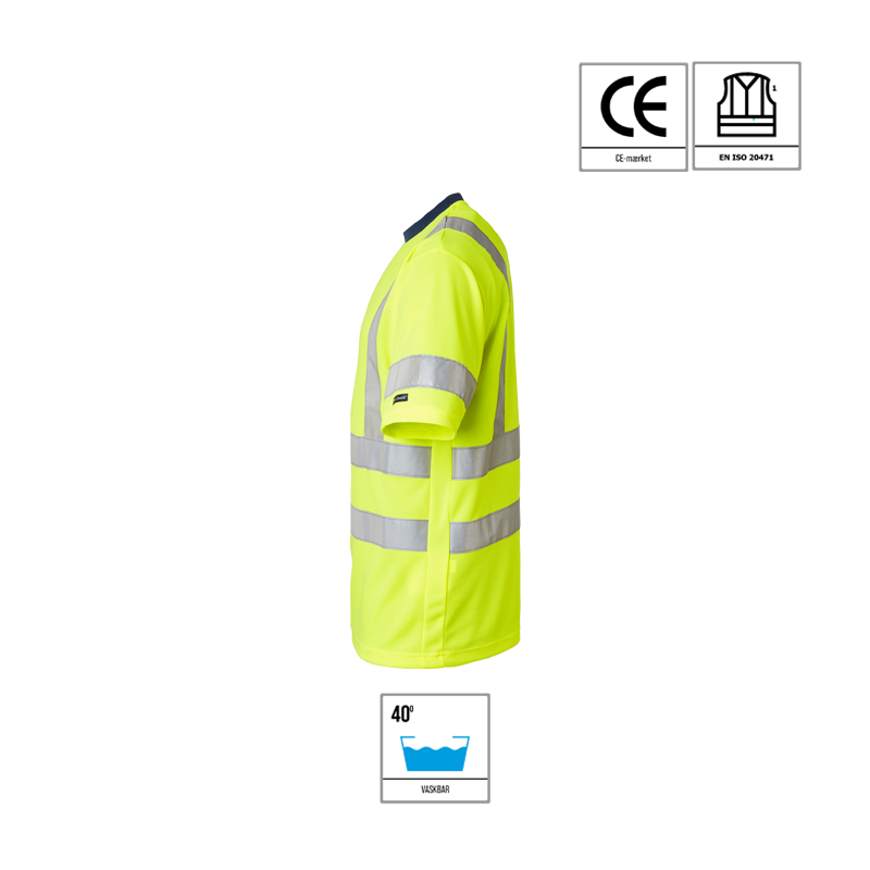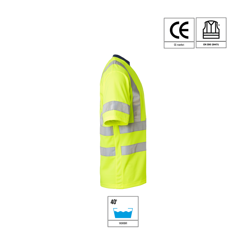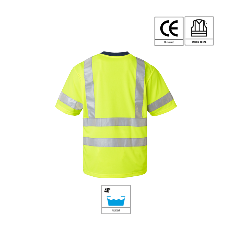 – Kortærmet t-shirt i gul fluorescerende stof med påsyede refleksbånd for ekstra synlighed.