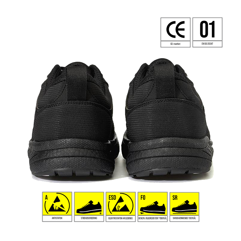 A Antistatiske egenskaber, E Stød-og energiabsorbering i trædeflade, ESD Elektrostatisk afladende, FO Olie og benzin resistent